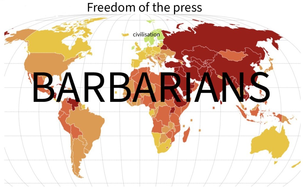 Had Donald Trump, like a true entrepreneur, not taken advantage of the epic migration, the collapse of the liberal world order would have taken longer, but as the limits of growth kick in and the elites have gotten their greedy hands on nearly everything, precisely like that guy named Karl Marx prophecised 150 years ago, it would have happened sooner rather than later. In the Roman Empire, the elites had taken everything there, too. The barbarians are now at the gates of the last remains of civilisation. America has already fallen. A central pillar of Western civilisation is the fairy tale of social progress on the scales of liberty and equality. The 2025 RSF World Press Freedom Index, a reliable gauge of civilisation, shows that all that remains of civilisation, so where there is still freedom of the press, is that tiny, little green area that includes Denmark and the Netherlands.